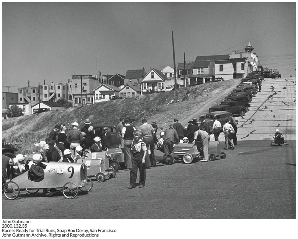 Photo-journalist John Gutmann documented the race. He’d arrived in San Francisco in the early-1930s, fleeing Nazi Germany, and taught at San Francisco State College, where he established creative photography, international film, and modern art history programs. Thousands of his distinctive photos are online at Arizona’s Center for Creative Photography.