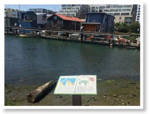 The signs are brightly illustrated, admirably informative, and sturdily installed, which may have required some help from teachers or parents. Did you know that sculpins, green crabs, red-tailed hawks, and nudibranchs all live in or around Mission Creek? I wasn’t familiar with what a nudibranch was until one of the signs told me. Apparently, it’s a “delicately colored” type of sea slug that can grow up to 16 inches long and live as long as one year. The “bizarre outgrowths” on its body are called “cerata.”