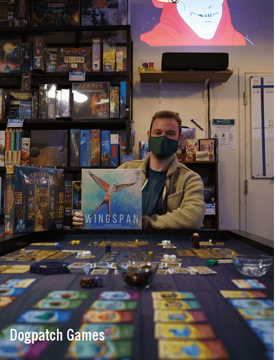 Sam, one of three owners of Dogpatch Games, with a personal favorite, ‘Wingspan.’ The owners, Sam, Shannon, and Kevin, are board game enthusiasts. Dogpatch Games, which soft-opened last summer, hosts a variety of community game-based events both inside and outside. One might mistake the outdoor parklet for a restaurant. “The idea is kind of like a restaurant: we have the tables but with games. After hours, people from offices will come and play games, kind of like happy hour, so we’re trying to tap into that energy for sure,” said Sam enthusiastically.