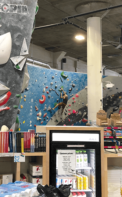 The facility offers hang boards – to strengthen fingers, hands, wrists, and arms – a cardio space, yoga studio, fitness room, campusing wall – for working the arms and upper body – a systems wall – a dedicated climbing area with regularly spaced pairs of holds – and a Kilter Board, a high-tech stand-alone device that can tilt at vertical angles, enabling a climber to hang from 10 degrees to 68 degrees. Locker rooms are equipped with free lockers, showers and saunas.