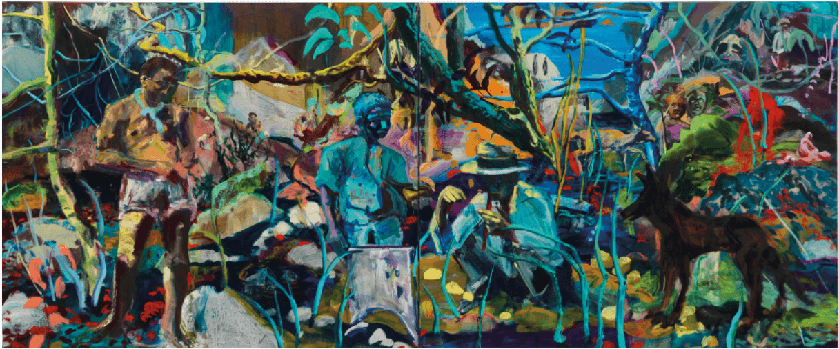 Palileo’s largest paintings are multi-panel meditations. They demand that the viewer stop and observe closely. Rendered in a pallet that’s at once explosive and layered, each canvas vibrates with life; scenes of lush vegetation populated with people and animals. Some figures are immediately apparent: others only become visible the longer one looks, like specters surfacing from beneath the depths of heavy brushstrokes or floating on the surface like slick oil.