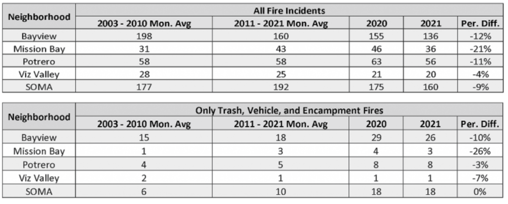The number of fire incidents has generally declined over the past decade, though Mission Bay and SoMa saw increases over the period. As reported in Mission Local, the quantity of small fires rose by 26 percent throughout the City, with as much as 50 percent more blazes in SoMa from 2019 to 2020.