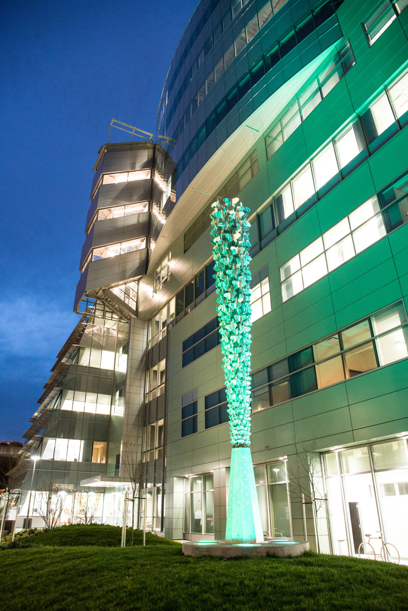 The finishing products and adhesives used to construct partitions and banquettes were formulated to prevent off-gassing of harmful emissions. The facility employs an efficient interior plumbing and irrigation design, as well as native landscaping, Wittorp said. There’s a small open space featuring a sculpture, a cone of butterflies rising into the sky, by Cliff Garten of Venice, California. Solar panels on the parking garage’s roof provide 10 percent of the building’s energy demand. “We’ve invested a lot in the insulation and effective use of natural light to reduce the energy we do need for the building,” he said.