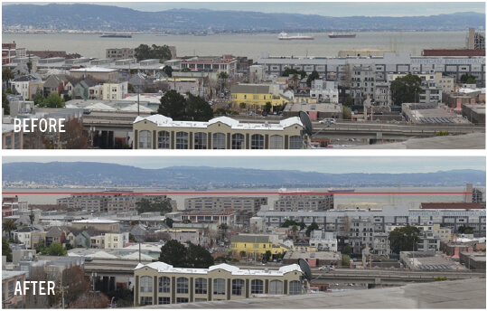 Viewing Pier 70 from near 22nd Street I’ve simulated impacts at a 155-foot view height using Photoshop. These simulations reference the steel structure’s height, and represent views that one might see from their homes. To be sure, my Photoshop studies aren’t as accurate as quality engineering simulations.