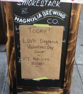 Making valentines day cards at the Museum of Craft & DesignCenter Hardware and the ‘pop ups’ they sponsored in their parking lotSmokestack at Magnolia Brewing signMcRoskey Mattress’s imaginative display at Richshaw Bagworks space.Rickshaw Bagworks