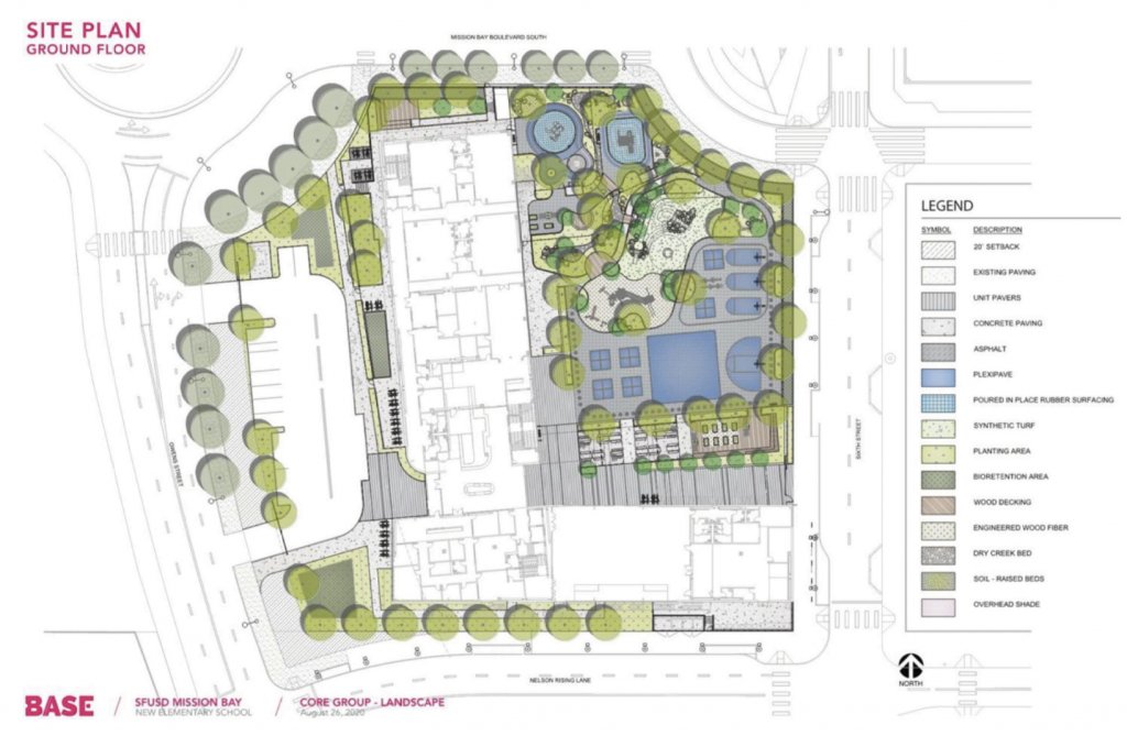 Close to a soccer field and SPARK Social SF food park activated by Parklab across Sixth Street to the east, and a large open space that’ll be developed for recreational activities across Owens Street to the west, “The schoolyard is nicely positioned to allow for easy pedestrian flow between those spaces,” Kamalanathan said. “The schoolyard would be sustainable and green, not just an asphalt jungle, but a place that’s inviting and complements the neighborhood’s existing open spaces and adds to that network.” The grounds will be landscaped, with a dry creek bed and bioretention area near the northeast cutout.