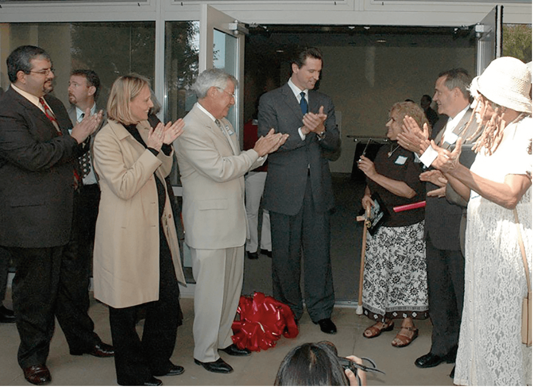 Gloria Hernandez, an octogenarian known to decorate her walker with signs for her local candidate of choice during election season, was the last of the original occupants to move in. She had the honor of applying scissors to ribbon with then-Mayor, now-Governor, Gavin Newsom.