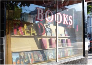 If you walk by quickly you might not notice anything different about Christopher’s Books. It’s still a gem of a neighborhood bookstore, that’s graced the 18th and Missouri streets corner for more than 25 years. Stop and look closely, however, and you’ll see two new paintings in the windows.