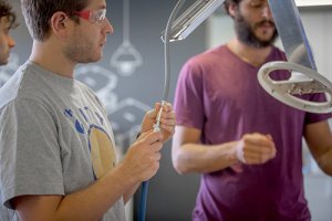 Andrew Windler and Yoav Ben-Haim testing the showerhead fluid pathway. Photo: Eduardo Nauiack