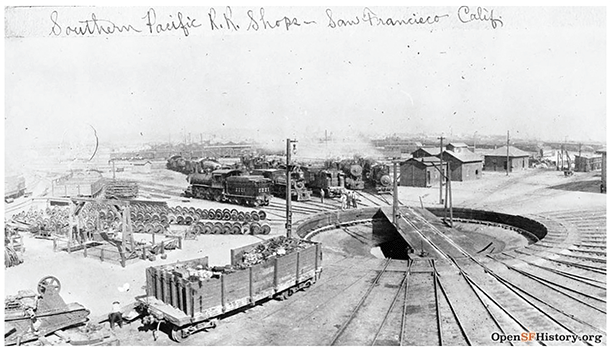 At the bottom of the hill, industry ran day and night: American Can Company, concrete plants, freight trains, and Southern Pacific’s roundhouse, where locomotives rolled onto a turntable and were spun into service bays adjacent to Mariposa Street. Wall and his friends wandered through stored passenger cars and cabooses. Once, a train engineer waved two kids into the cab and let them ride the locomotive onto the turntable before kicking them out.
