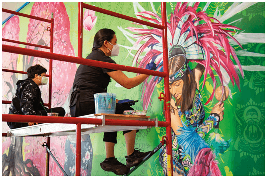 In addition to the permanent collection and new works in photography and video, two closely related exhibitions stand out. Close to Home and Bay Area Walls feature local artists with pieces that respond to the ongoing public health crises and fight for racial justice.