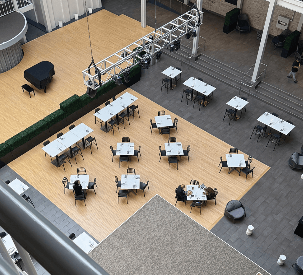 The café at the Galleria, tables beautifully set with glassware and napkins, is open to the public, said an employee, “…and the food is quite good”. A to-go menu features light lunch options and pastries from Neighbor Bakehouse. Just two out of sixteen tables were occupied midday on a recent Friday.