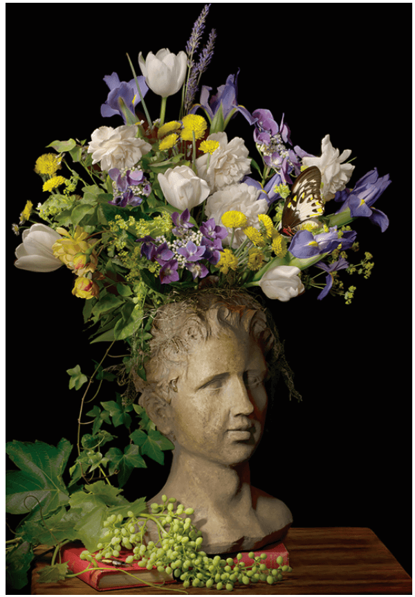 Bowl of Cherries reads like a classic still life with arrangement of fruit and flowers; Yellow Lillies puts greater emphasis on the floral array. Roman Head incorporates a Classical bust, evoking further communion with art history. A close look at each composition betrays the fact that they’re made of multiple exposures: blurred edges where one take overlaps the other become evident, lending to the painterly quality of the work. Inclusion of pinned butterflies in each picture feels like a reminder of the fleeting capture of a photograph, even if Carnochan’s process defies this.