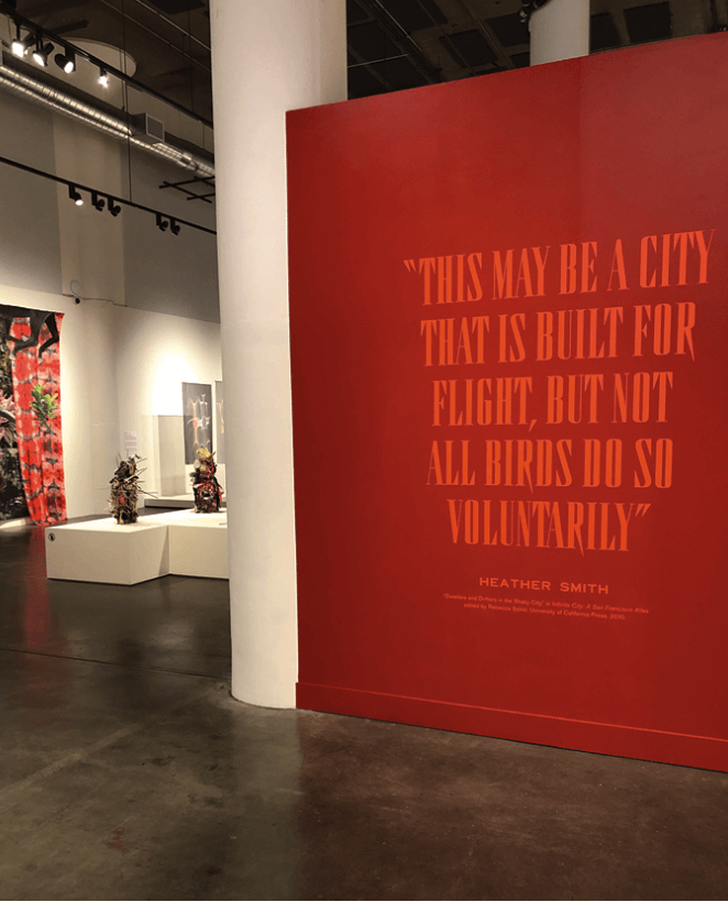 Dogpatch is a fun place to wander around and explore, with its numerous parks, green spaces, and clearly identified slow streets and walking paths. One place worth visiting, the Museum of Craft & Design, is tucked into a large warehouse building near the Third and 20th streets Muni stop. It’s recent “Fight and Flight: Crafting a Bay Area” show featured a mix of textiles, prints, ceramics, paintings, found art and an audio immersive piece, highlighting the works of Bay Area residents Libby Black (Berkeley), Angela Hennessy (Oakland), and Richard-Johnathan Nelson (Oakland), among others.